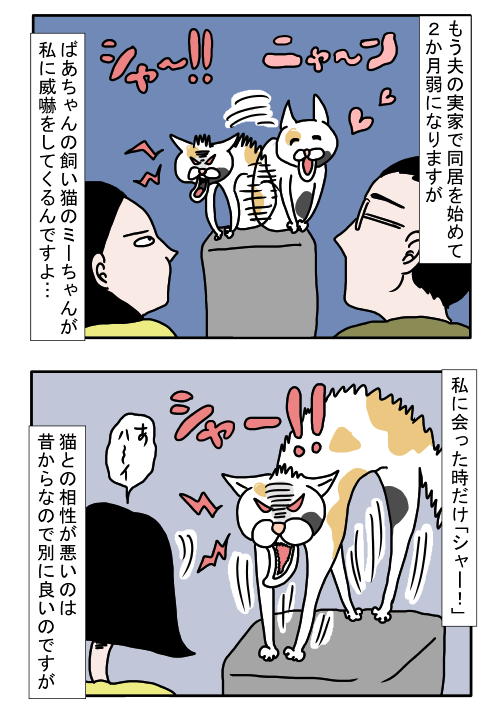私も結婚したばかりの時、旦那の飼い猫に背後からハイキックされたりして、すんごくコワかったんです。