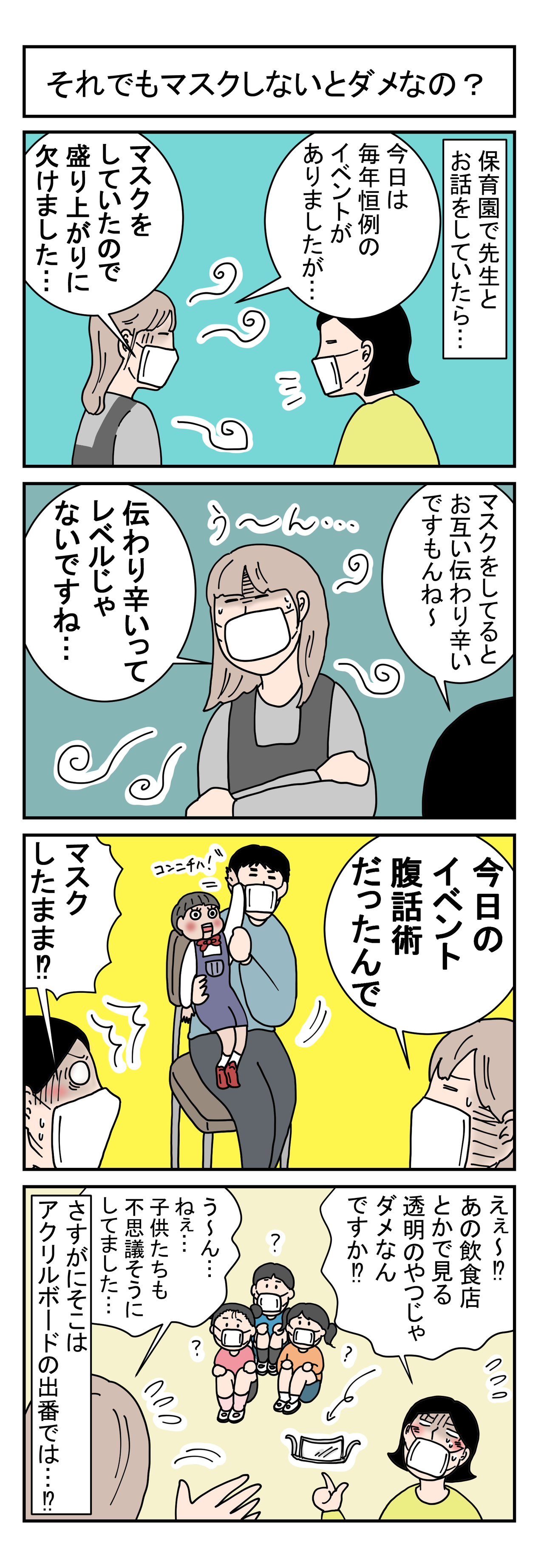 それでもマスクしないとダメなの? 2021年10月30日 初めましての方もいつも見に来てくださる方もありがとうございます アラフォー夫婦&4歳ムスコの日常などを毎朝6時に更新しています 本日はそれでもマスクしないとダメなの?のお話です イベントの写真を見たらガッツリ白マスクで腹話術してた シュールで耐えら ... 続きを読む
