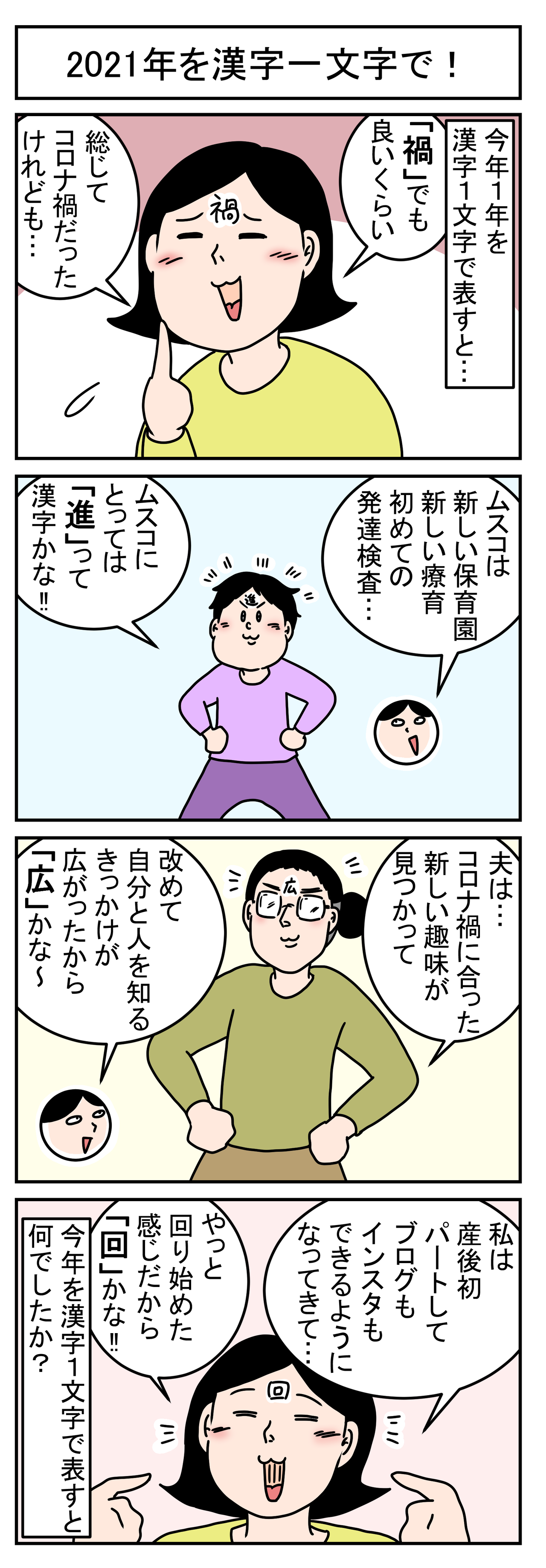2021年を漢字一文字で! 2021年12月31日 初めましての方もいつも見に来てくださる方もありがとうございます アラフォー夫婦&4歳ムスコの日常など毎朝5時に更新しています 昨日は3回投稿ありました!1回目 よく転ぶ友人の子 その後2回目 子の友達選びとママ友 後編3回目 中身が分からないおせちが来た! ... 続きを読む